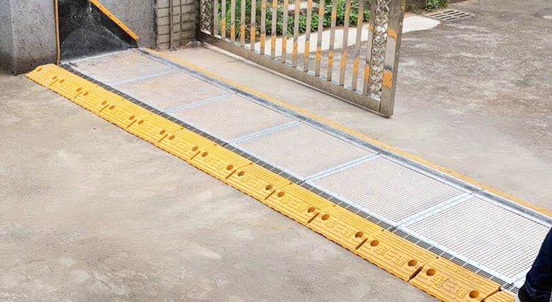 無(wú)水時(shí),擋水板伏臥在地面框體上。車輛可以正常通行。