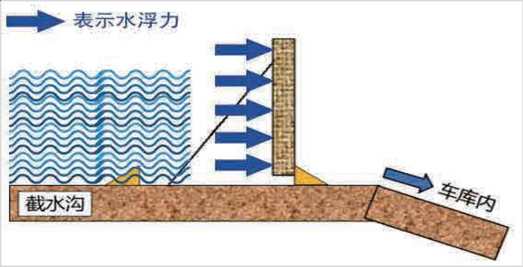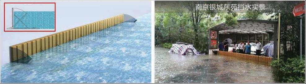 當(dāng)洪水來(lái)襲時(shí),由于擋水板正義密度小于水,擋水板在迎面洪水浮力作用下,自動(dòng)翻轉(zhuǎn)成直立狀態(tài)而擋住洪水。擋水過(guò)程無(wú)需電力驅(qū)動(dòng)。