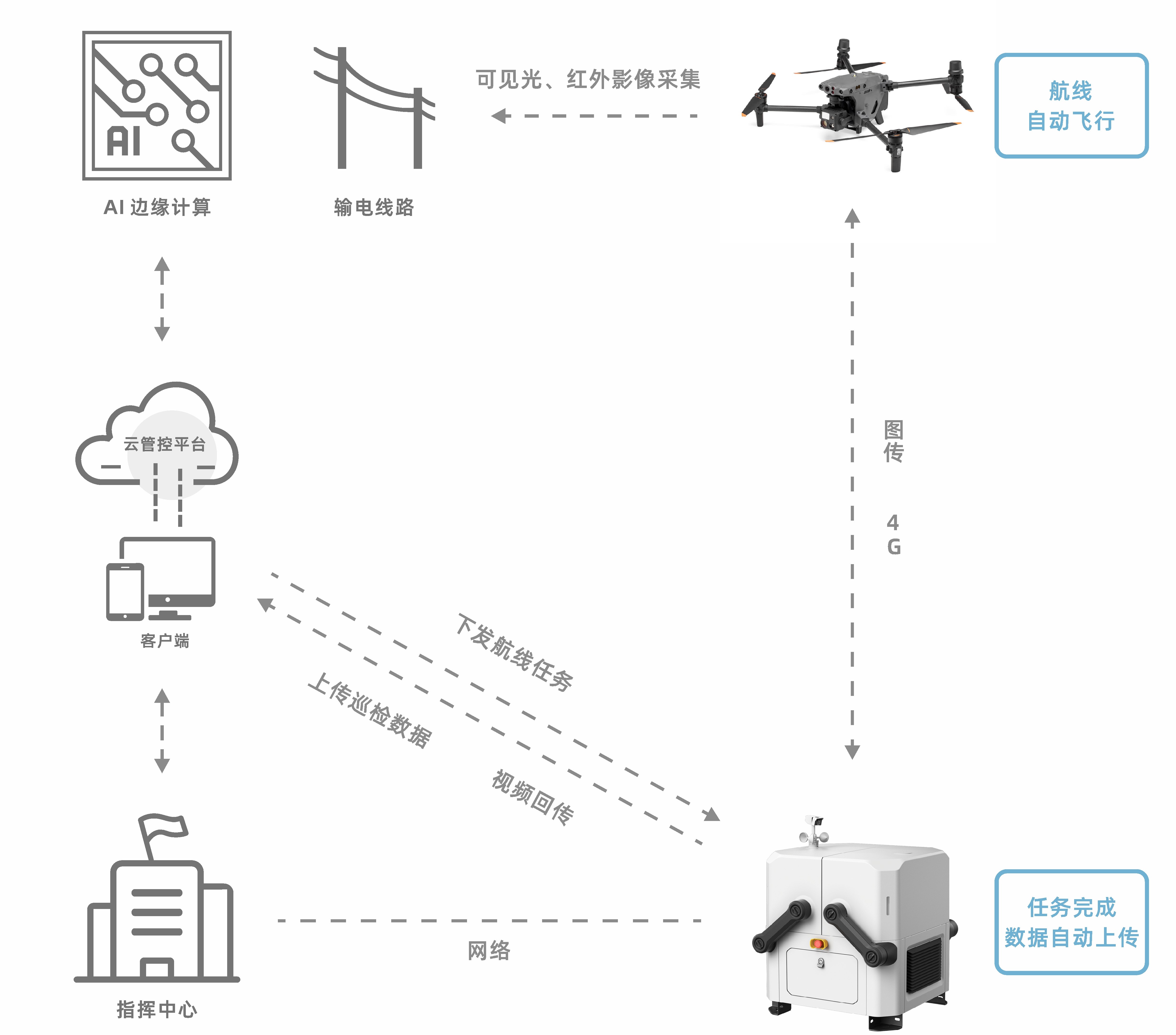 無人機(jī)智慧巡檢系統(tǒng)以無人機(jī)機(jī)場作為基礎(chǔ)硬件支撐,通過智能控制平臺實現(xiàn)無人機(jī)遠(yuǎn)程調(diào)度、無人值守、自動飛行及數(shù)據(jù)回傳,再利用云端數(shù)字管控平臺,將作業(yè)過程中采集的數(shù)據(jù)進(jìn)行AI智能識別,生成巡檢報告,對發(fā)現(xiàn)的異常進(jìn)行自動報警并通過短信、多終端消息等方式推送至相關(guān)檢修人員,從而幫助檢修人員更快發(fā)現(xiàn)缺陷,及時消缺,保障線路及變電站的安全運行。從地面到空中再到云端的全自動化作業(yè)方案,實現(xiàn)真正“無人化”,有效拓展無人機(jī)任務(wù)覆蓋范圍,實現(xiàn)業(yè)務(wù)閉環(huán)。
