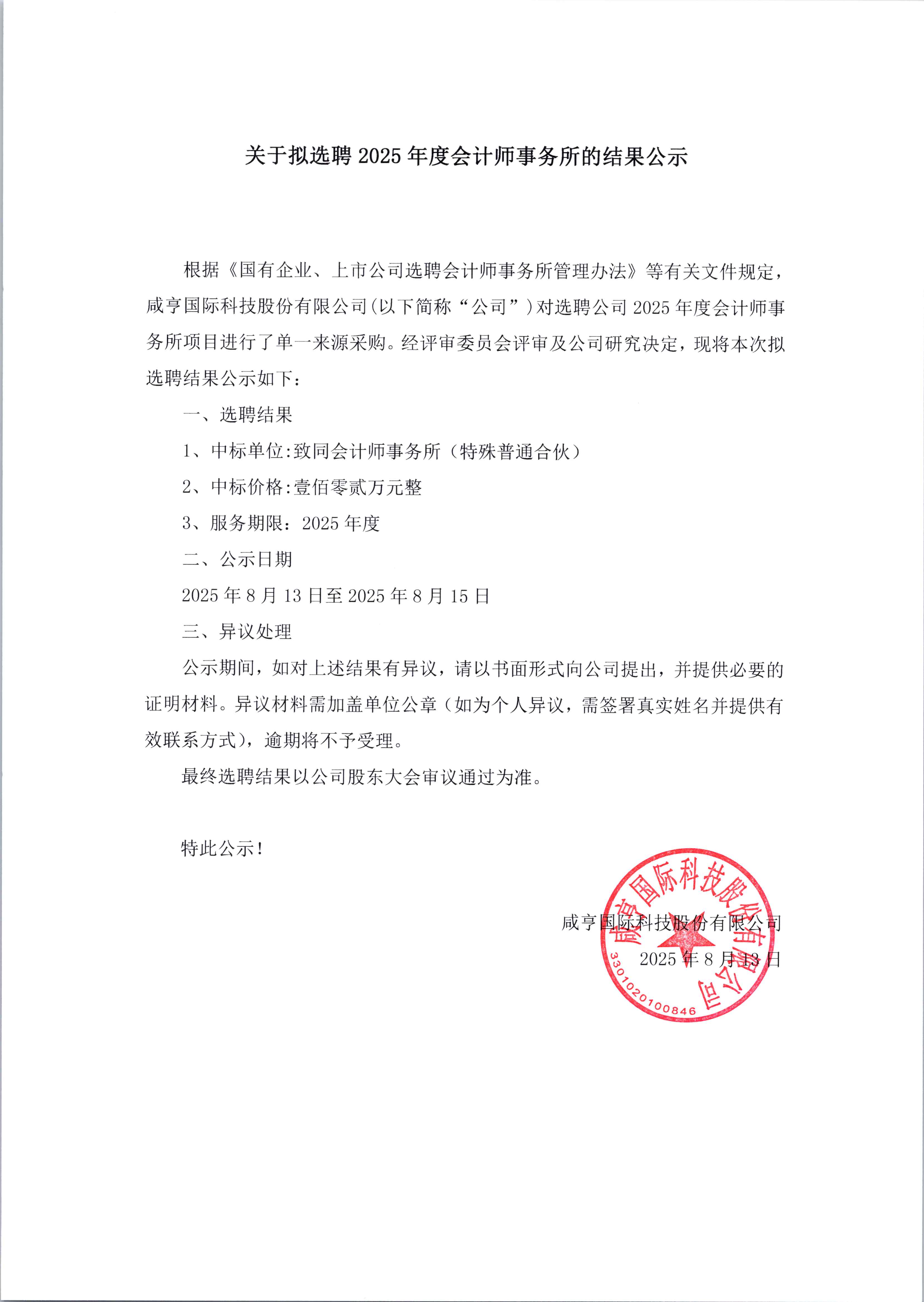 關(guān)于擬選聘 2025年度會計(jì)師事務(wù)所的結(jié)果公示